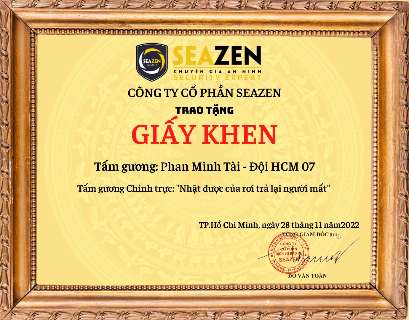 9. Đồng chí Phan Minh Tài – Đội HCM 07 ngày 28/11/2022: ” Nhặt được của rơi trả lại người mất” – Trao tặng bằng khen và huy hiệu “Chính trực”.