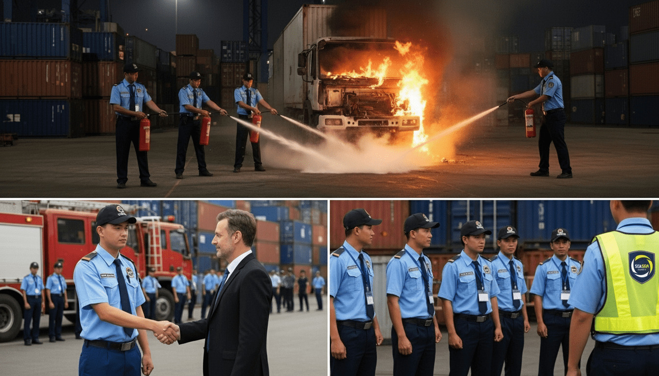 Với sự cảnh giác cao độ và quy trình ứng phó sự cố khẩn cấp đã được tập huấn kỹ lưỡng, đội ngũ bảo vệ SeaZen ứng phó cháy xe hàng đã hành động chớp nhoáng theo đúng quy trình: